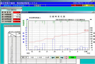 resulting from flooding. With a rooftop-mounted digital rain gauge, Komatsu Factory Co.'s systems are configured to provide timely information right where it's needed. Rainfall intensity (10-minute precipitation) is accurately monitored around the clock, and the latest information and any pertinent alarm data are displayed on-screen. Precipitation data measured by the rain gauge is converted into digital format and automatically stored by a data logger. The data logger and a personal computer are directly connected using RS232C format. Rainfall intensity data is transmitted every 10 minutes from the data logger to the PC, which collates and records data and triggers an alert or alarm when necessary. Monitoring screen displays are also automatically updated with each transfer of data. |