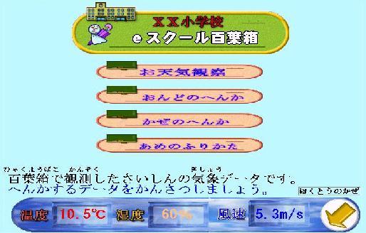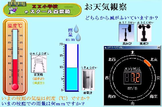 | eスクール百葉箱は、学校内に設置された風向風速計、温度計、湿度計、雨量計で観測された気象データを、リアルタイムで専用パーソナルコンピュータにて自動収集し、校内LANを通じて接続されたPCで表示し学校教材として利用するシステムです。 専用アプリケーションにより、10分毎に観測されたデータのグラフ表示、日表、月表等の表示・印刷ができます。 担当教員は、これらの情報を利用し、又集録されたデータを加工し、教材作成が可能です。 又本システムは、データ収集時に気象関連ページを自動作成し、校内WWWサーバーに自動転送します。同時に登録されたアドレスにe気象メールを自動作成・転送します。区防災情報、区教育委員会セントラルサーバー気象共有情報として活用も可能です。 |